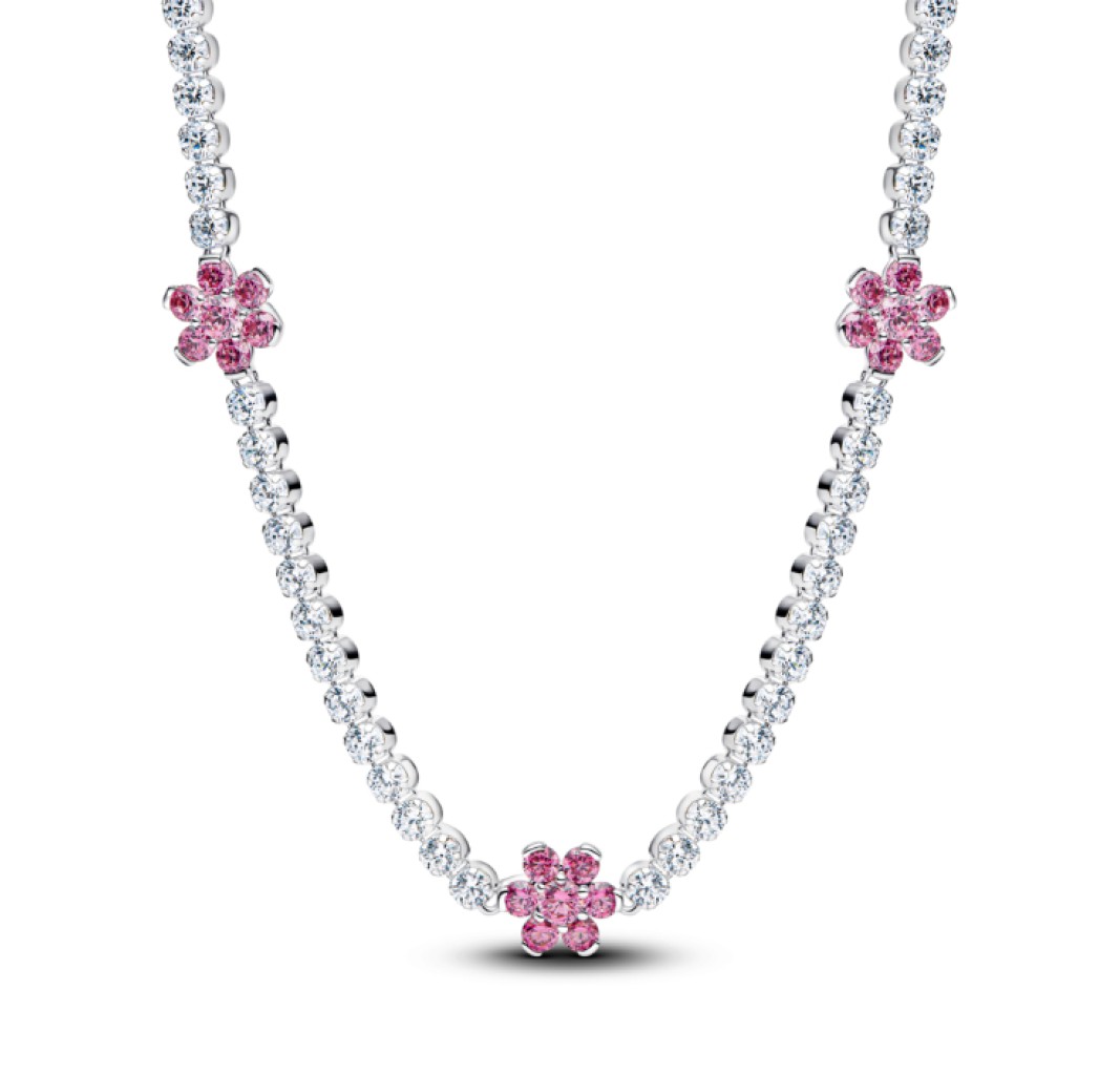 PANDORA 394561C01 Gargantilla de plata de ley con flores, circonitas cúbicas transparentes de color rosa elegante y cierre deslizante