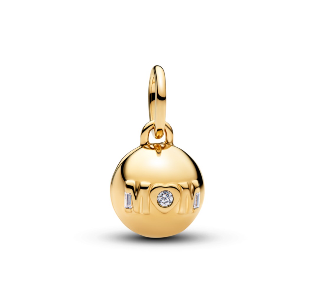 PANDORA 764457C01 Colgante con forma de bola de mamá que se puede abrir, chapado en oro de 14k, con circonitas cúbicas transparentes.