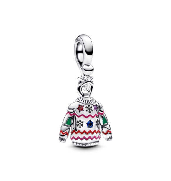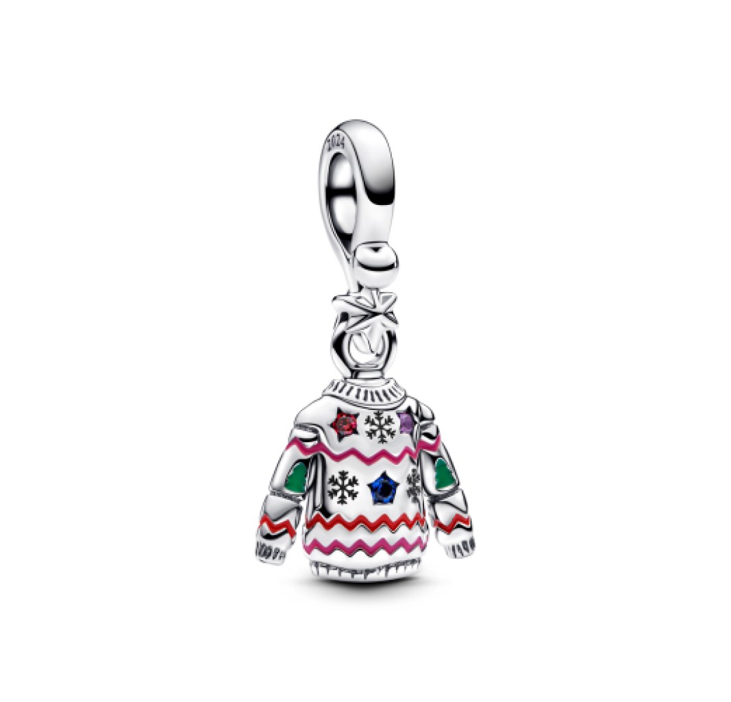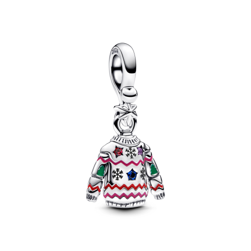 Charm colgante de plata de ley con forma de jersey navideño con circonita cúbica roja, cristal azul real y violeta real, esmalte rojo, rosa y verde