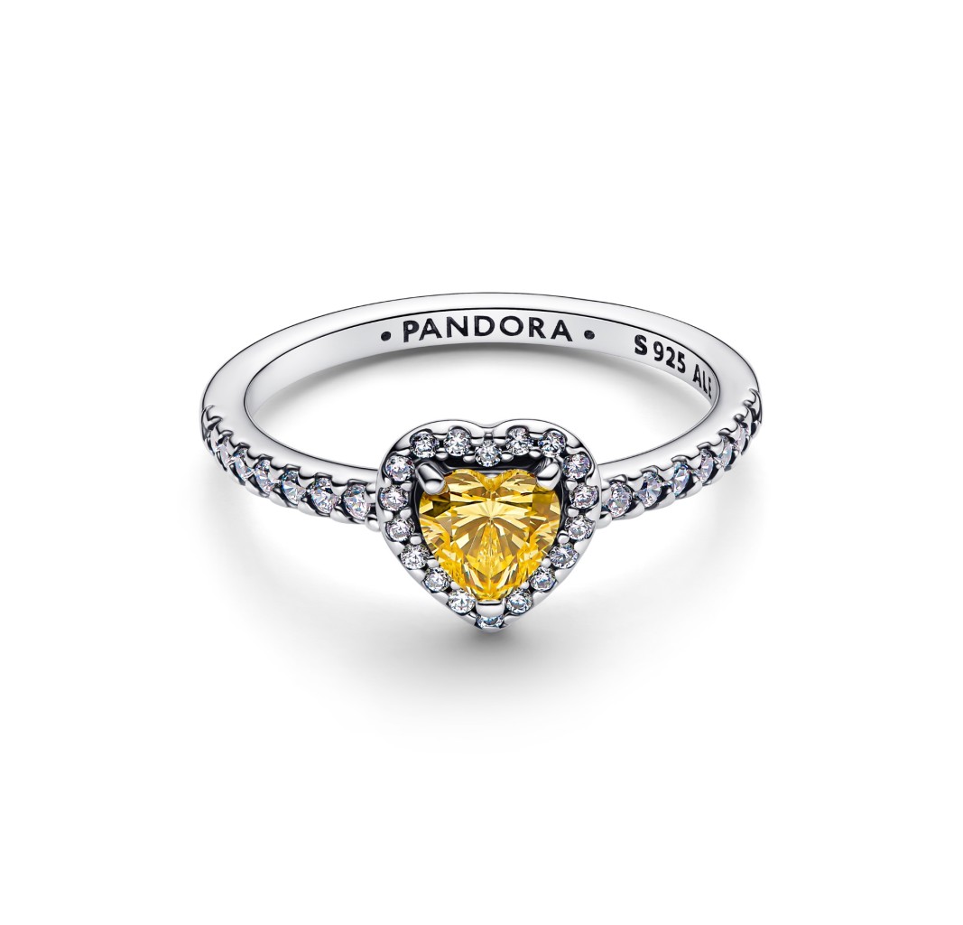 PANDORA 198421C06 Anillo de plata de ley con forma de corazón y circonitas cúbicas amarillas y transparentes vibrantes.