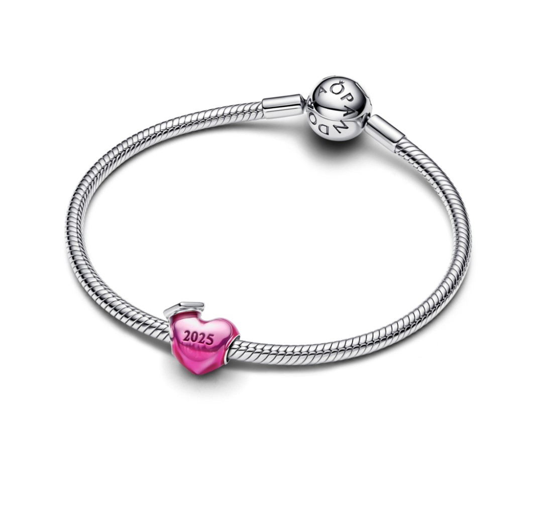 PANDORA 793788C01 Charm de plata de ley con forma de corazón de graduación 2025 y esmalte rosa transparente.