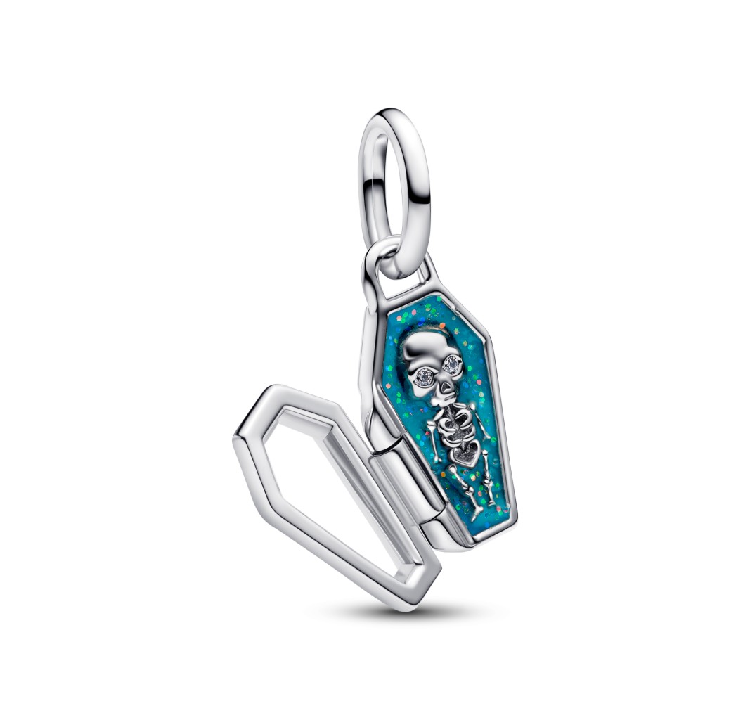 PANDORA Openable coffin sterling silver dangle with clear cubic zirconia and glittery teal glow in the dark enamel