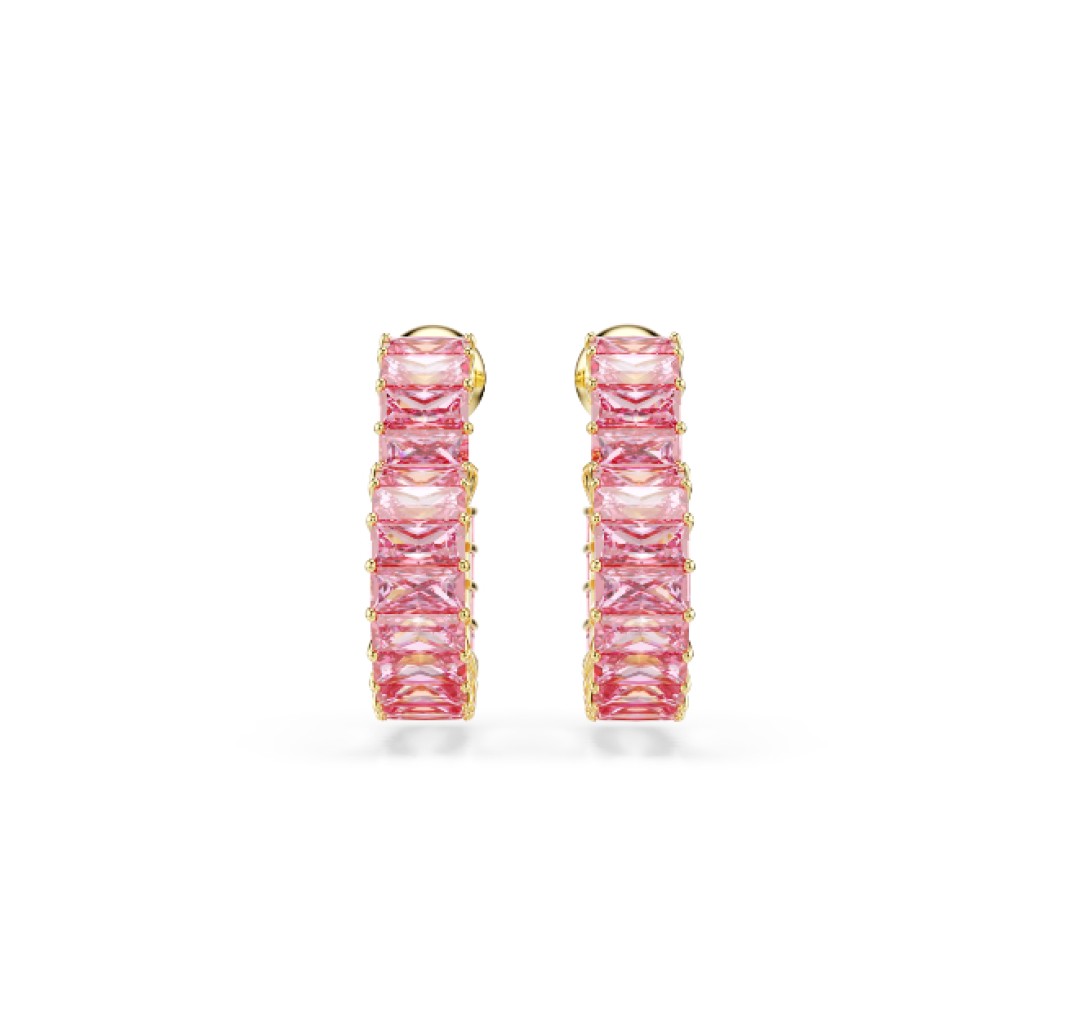 SWAROVSKI PENDIENTES DE ARO MATRIX, TALLA BAGUETTE, CORAZÓN PEQUEÑOS ROSAS, BAÑO TONO ORO.
