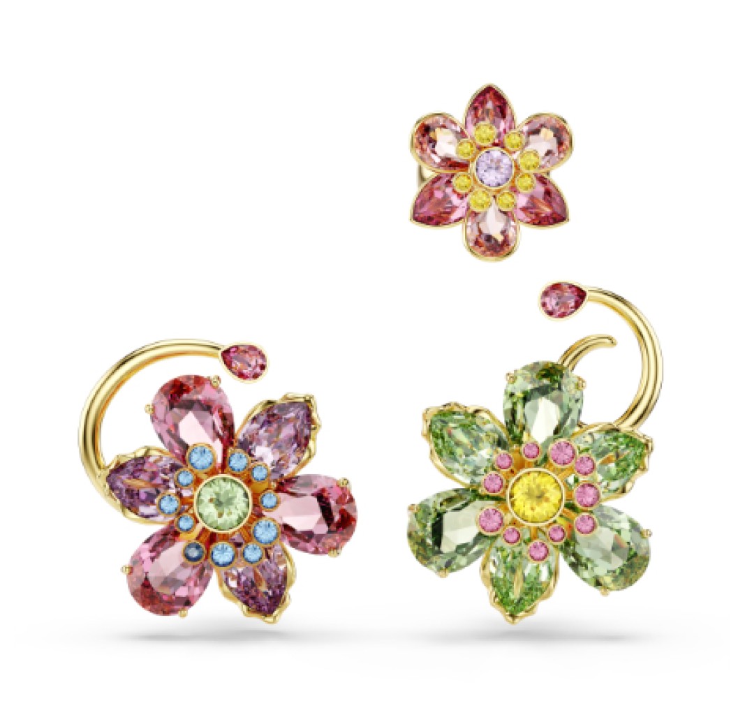 SWAROVSKI PENDIENTES EAR CUFF IDYLLIA, SET 3, DISEÑO ASIMETRICO, TALLAS MIXTAS, FLOR MULTICOLOR, BAÑO TONO ORO